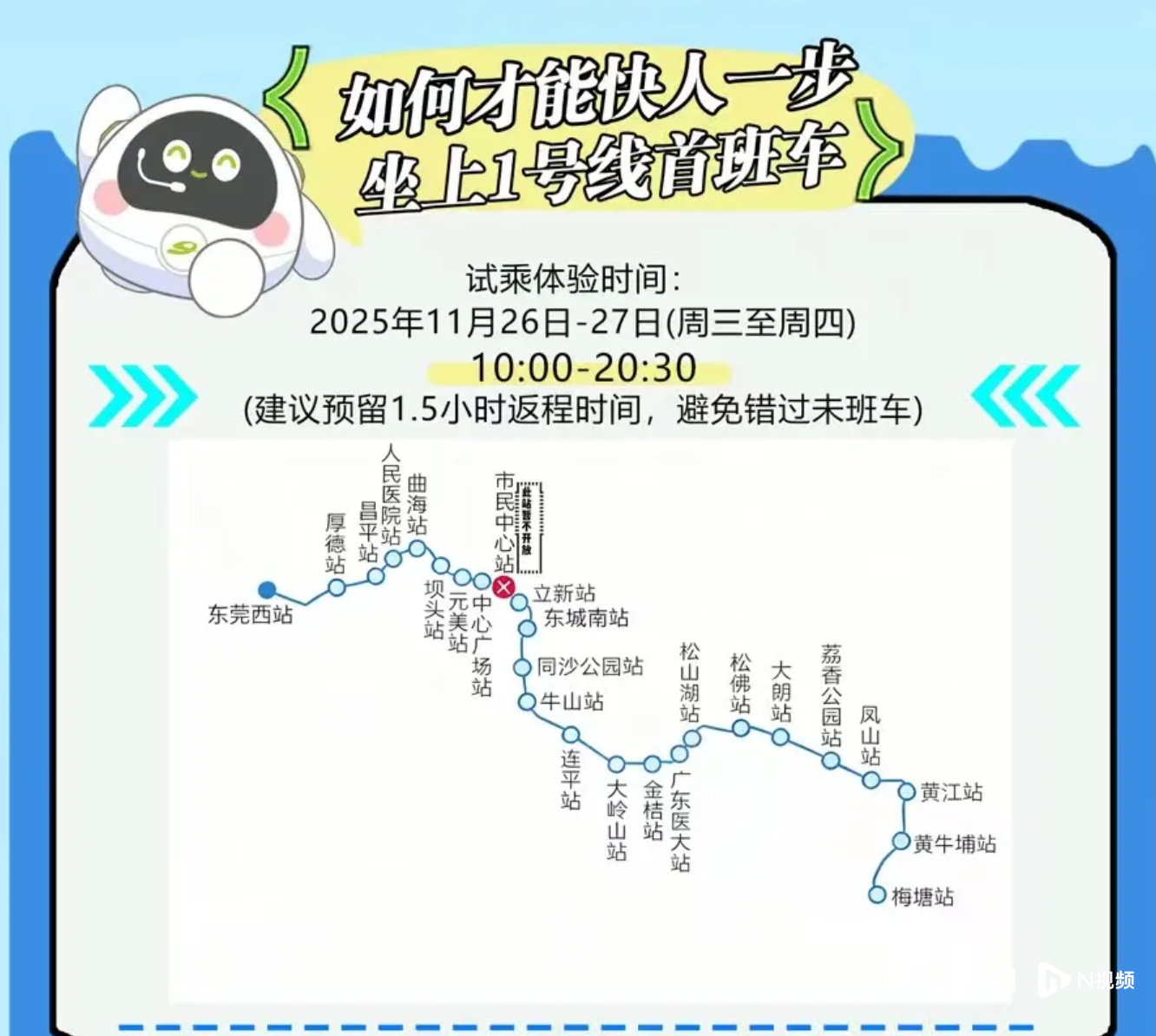 据介绍,11月26日和11月27日,地铁1号线将开展为期两天的试乘活动(时间为每天10:00-20:30),倡导市民可下载“东莞地铁APP”免费进站乘车,试乘期间按照正常安检进站,请勿携带违禁用品。试乘体验期间,市民中心站将执行不停站作业(列车不停靠),市民无需前往该站乘车,可选择从中心广场站或立新站进入。